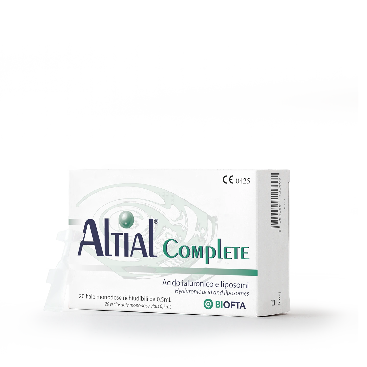ALTIAL® COMPLETE Eye Drops are a medical device for ophthalmic use consisting of a slightly hyposmolar, sterile, physiological pH, preservative-free solution containing a combination of medium molecular weight hyaluronic acid and liposomes, in 0.5 mL single-dose vials. The liposomes, in combination with hyaluronic acid, provide functional support to the ocular surface, replenishing the lipid layer, which is used to contain and control the evaporation of the tear film. ALTIAL® COMPLETE is also able to regulate and improve the lubrication and hydration of the ocular mucosa. ALTIAL® COMPLETE Eye Drops are indicated for the relief of redness, dryness and eye fatigue in cases of dry eye syndrome, particularly those caused by the inadequate quality of the lipid layer of the ocular surface, environmental stress (dust, allergens, smoke, air conditioning, environmental pollution) and visual stress due to the use of computers, televisions and video terminals. The product can also be administered while wearing contact lenses to improve ocular lubrication and comfort. -