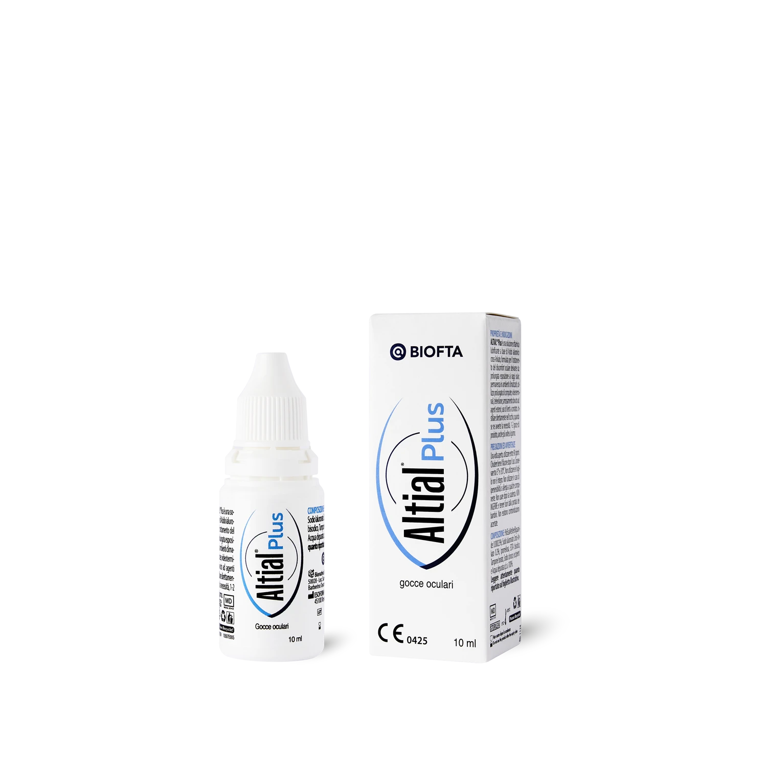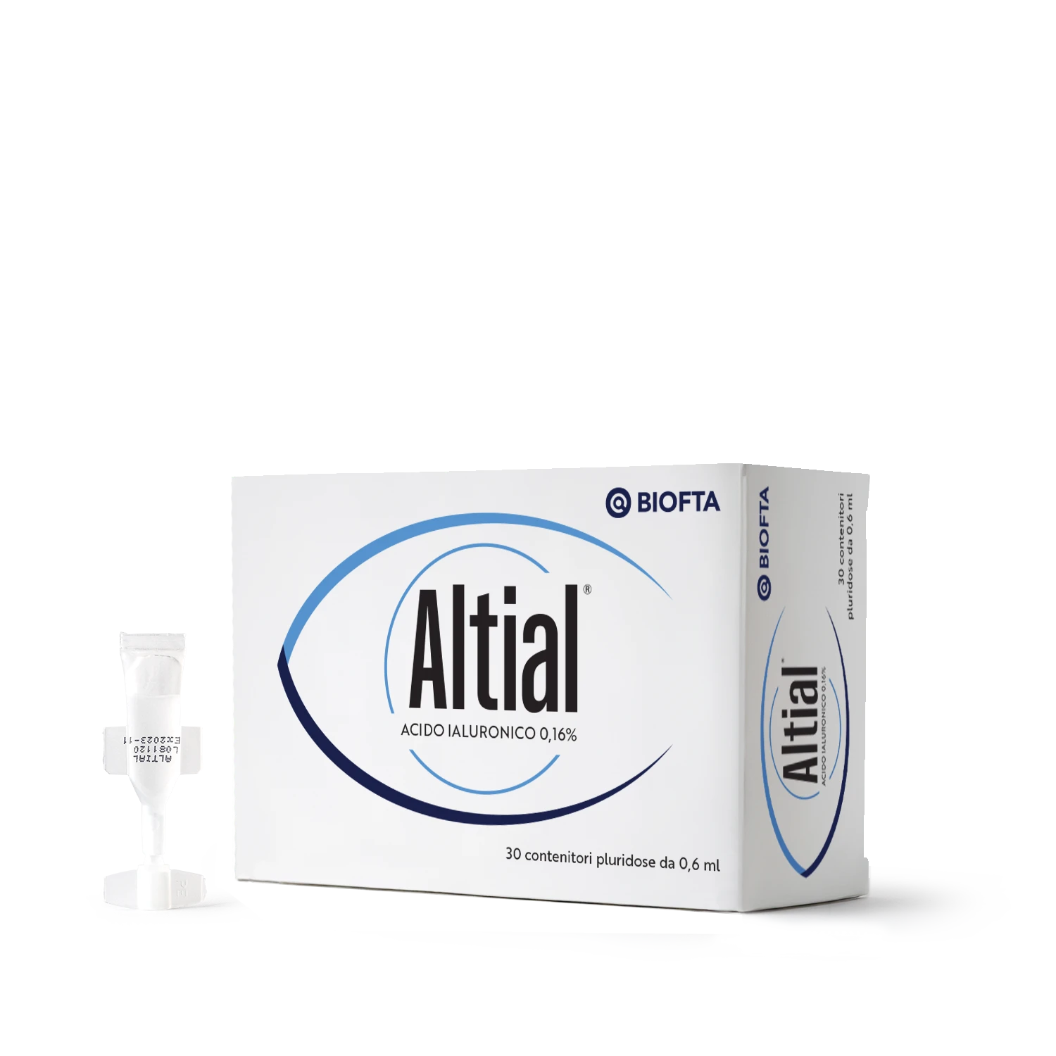 ALTIAL® Plus is a lubricating ophthalmic solution based on cross-linked hyaluronic acid, formulated for the treatment of ocular discomfort. Cross-linked hyaluronic acid represents a great opportunity because it is a molecule that retains all the properties of linear hyaluronic acid, but thanks to its unique structural characteristics, it has greater stability and a longer retention time in the cornea and conjunctiva. In fact, thanks to its cross-linked structure, cross-linked hyaluronic acid has a higher viscosity stability than linear hyaluronic acid and is degraded more slowly by corneal hyaluronidase. Cross-linked hyaluronic acid thus gives ALTIAL® Plus high viscoelasticity, ensuring a high degree of hydration and permanence on the ocular surface, such as to alleviate the symptoms associated with dry eye syndrome, even in severe cases. ALTIAL® Plus can also be administered for ocular lubrication during and after:- prolonged exposure to sunlight, UV and ionising radiation;