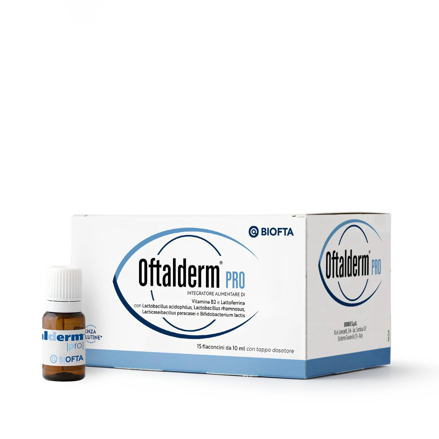 Oftalderm® Pro è un integratore alimentare di Vitamina B2 e Lattoferrina, con Lactobacillus acidophilus DSM34415, Lactobacillus rhamnosus ATCC 53103, Lacticaseibacillus paracasei SD-5275 e Bifidobacterium lactis DSM34438, utile a compensare le carenze nutrizionali o gli aumentati fabbisogni di tali nutrienti. La Vitamina B2 contribuisce al mantenimento della normale capacità visiva. -