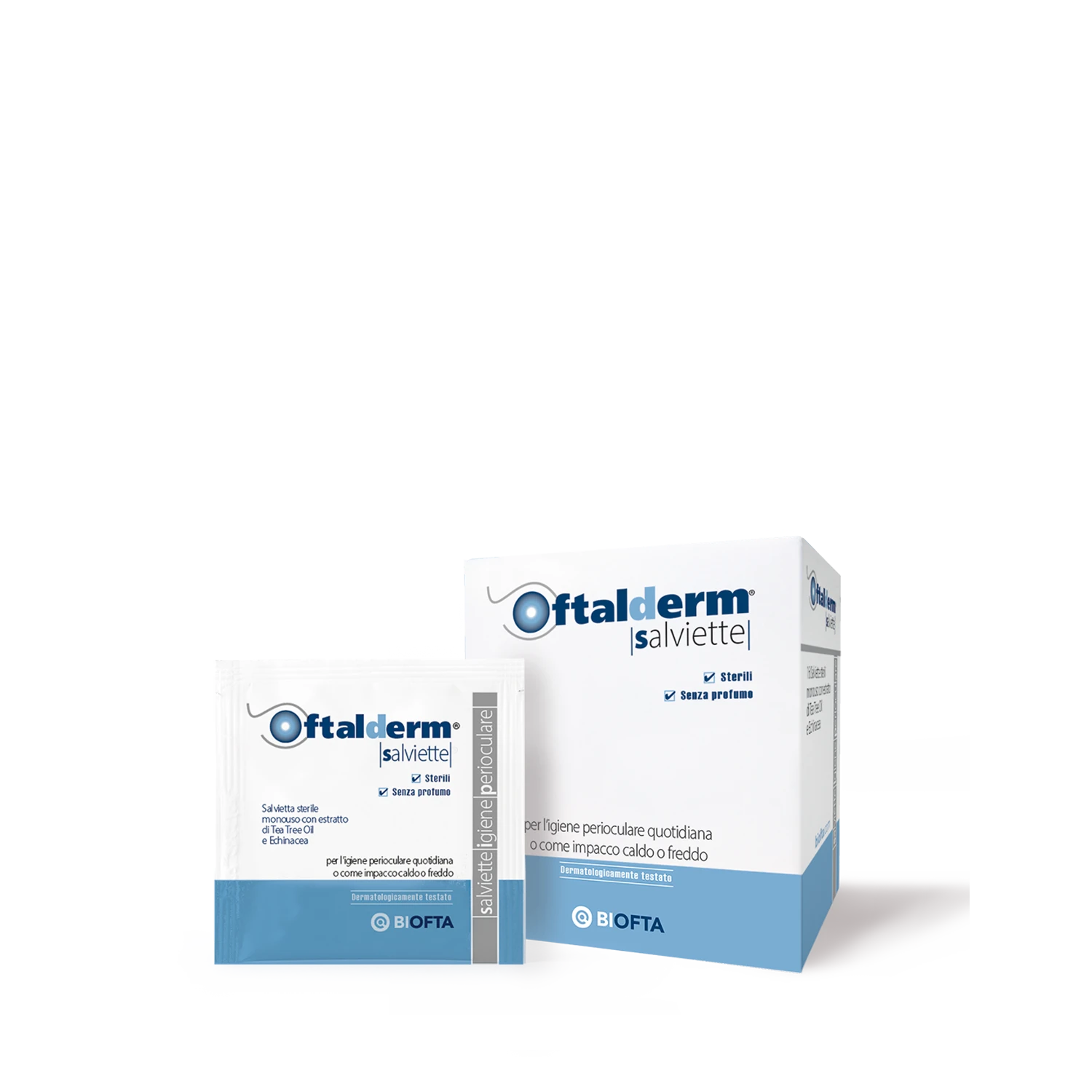 OFTALDERM® SALVIETTE è un prodotto indicato per la detersione delle palpebre e delle ciglia in ogni situazione che richieda un’azione delicata a causa dell’elevata sensibilità della zona perioculare; è anche indicato nel decorso post-operatorio (in assenza di ferite). OFTALDERM® SALVIETTE è costituito da morbide salviette imbibite con una formulazione contenente anche ingredienti di origine naturale che rende confortevole il momento dell’applicazione e consente la rimozione di residui squamosi, di muco e di eventuali residui di farmaci o prodotti per il trucco. Gli estratti vegetali ad azione emolliente contenuti nella crema idratano e rinfrescano la zona perioculare apportando sollievo. La bustina chiusa può essere sia scaldata in acqua tiepida (40°C circa), per utilizzare la salvietta come impacco caldo e rimuovere i residui particolarmente persistenti, sia raffreddata in frigorifero, per applicare sull'occhio la salvietta come impacco freddo. -
